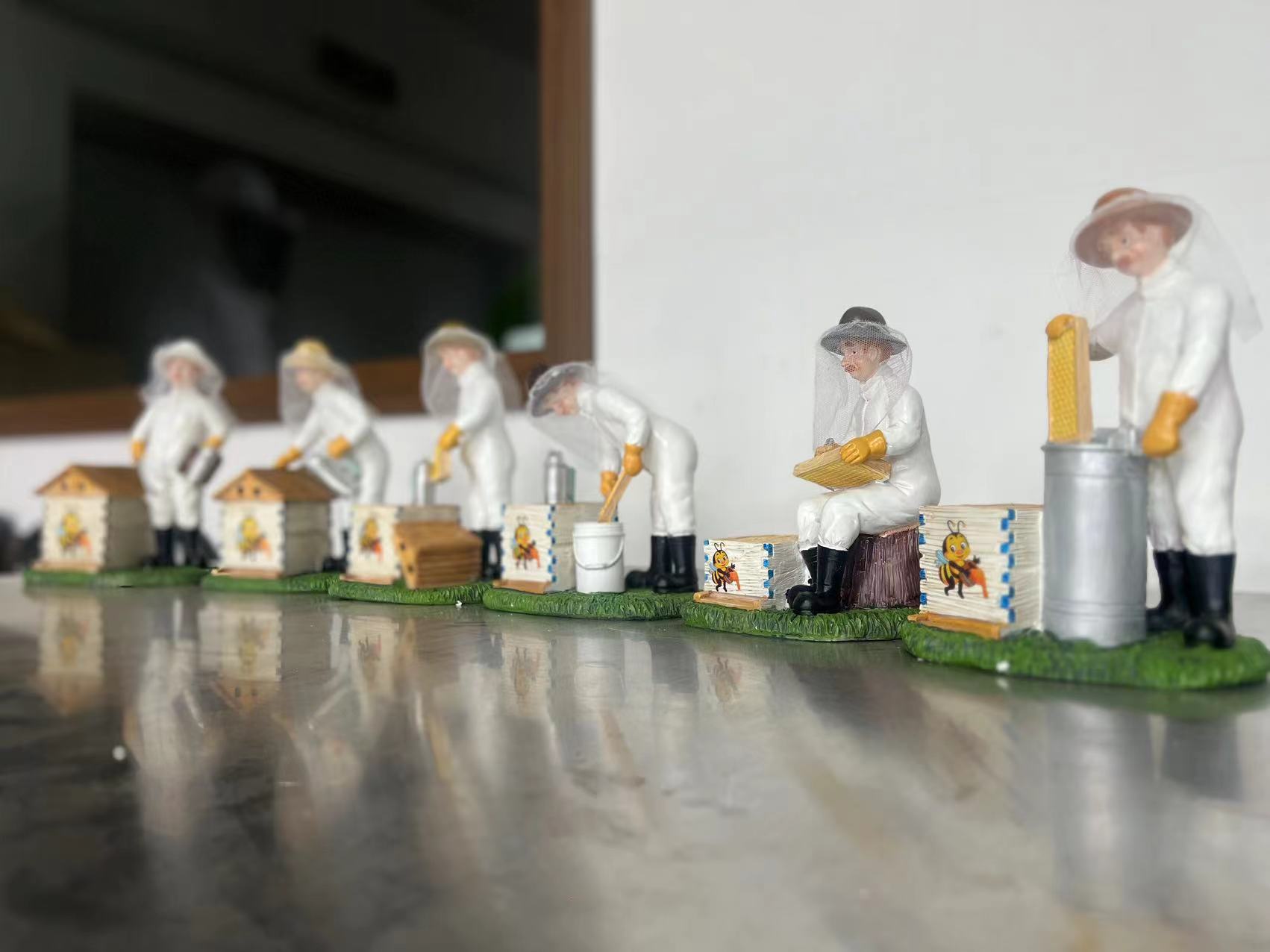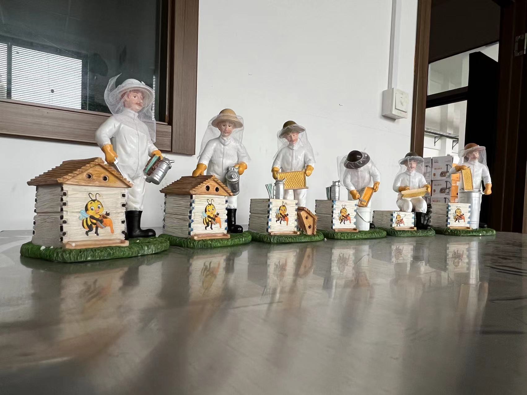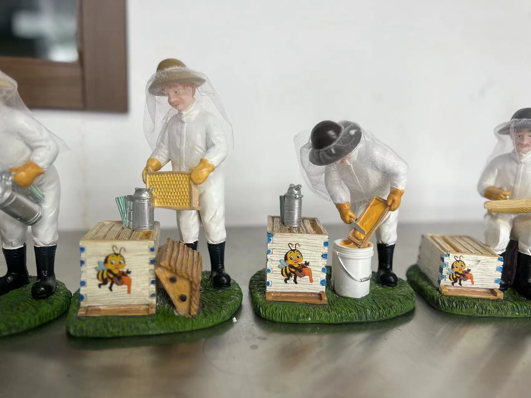 这一整套模型构成了一个完整的“养蜂作业流水线”缩影。它不仅仅是静态的摆件,而是通过不同的人物动作,系统地展示了养蜂人“准备(烟熏) -> 检查(提脾) -> 收获(摇蜜)”的专业工作流程,非常适合用于科普教育或作为养蜂爱好者的收藏展示。