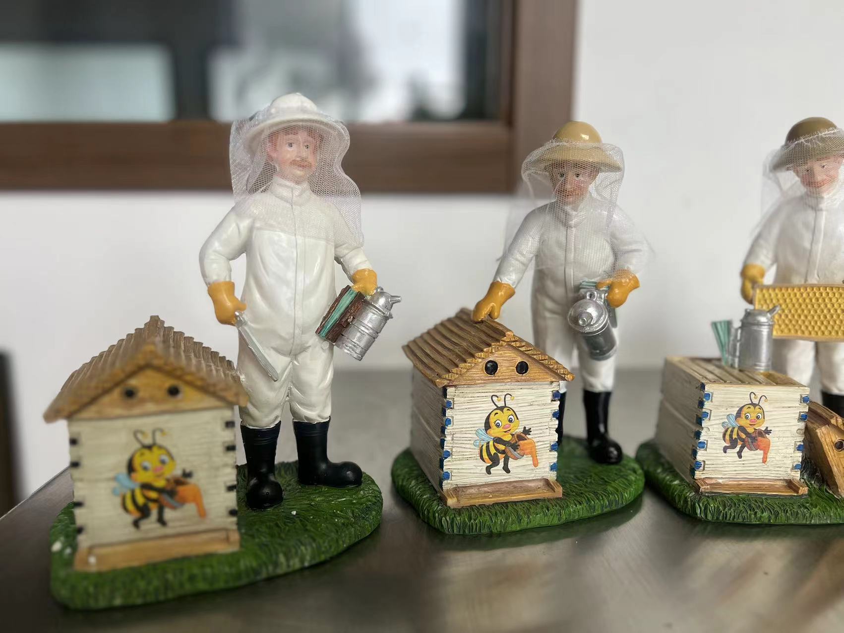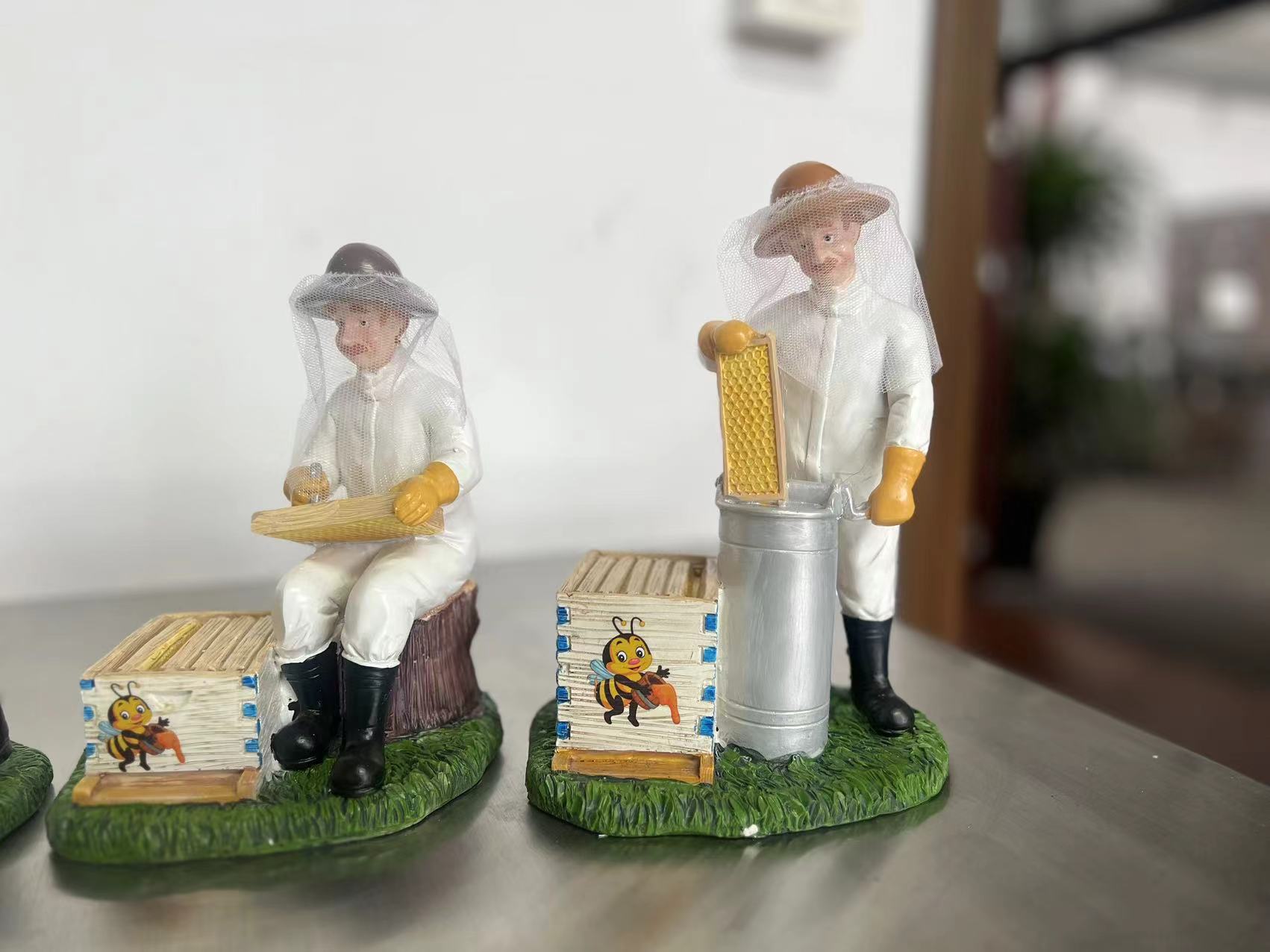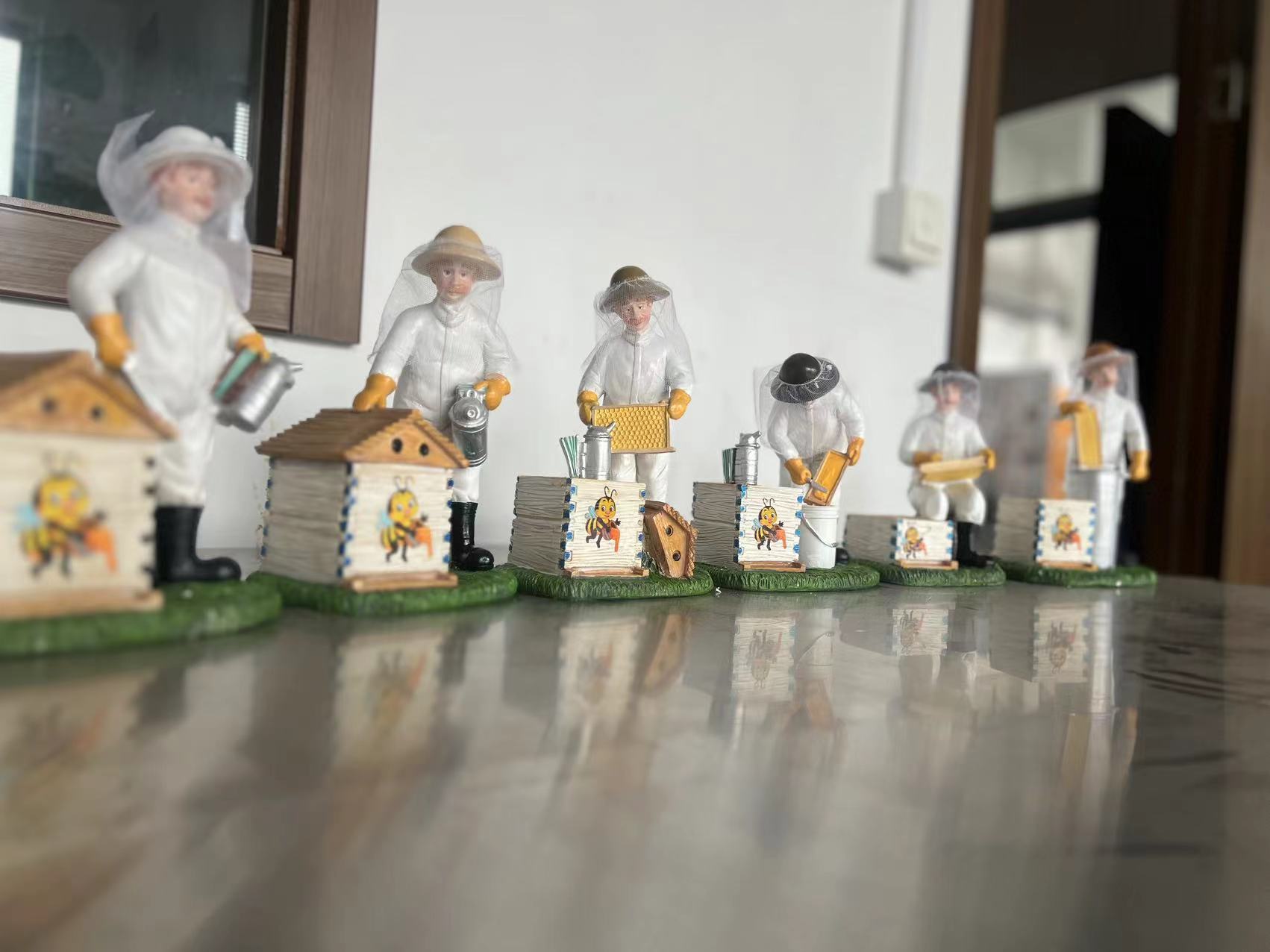 这一整套模型构成了一个完整的“养蜂作业流水线”缩影。它不仅仅是静态的摆件,而是通过不同的人物动作,系统地展示了养蜂人“准备(烟熏) -> 检查(提脾) -> 收获(摇蜜)”的专业工作流程,非常适合用于科普教育或作为养蜂爱好者的收藏展示。